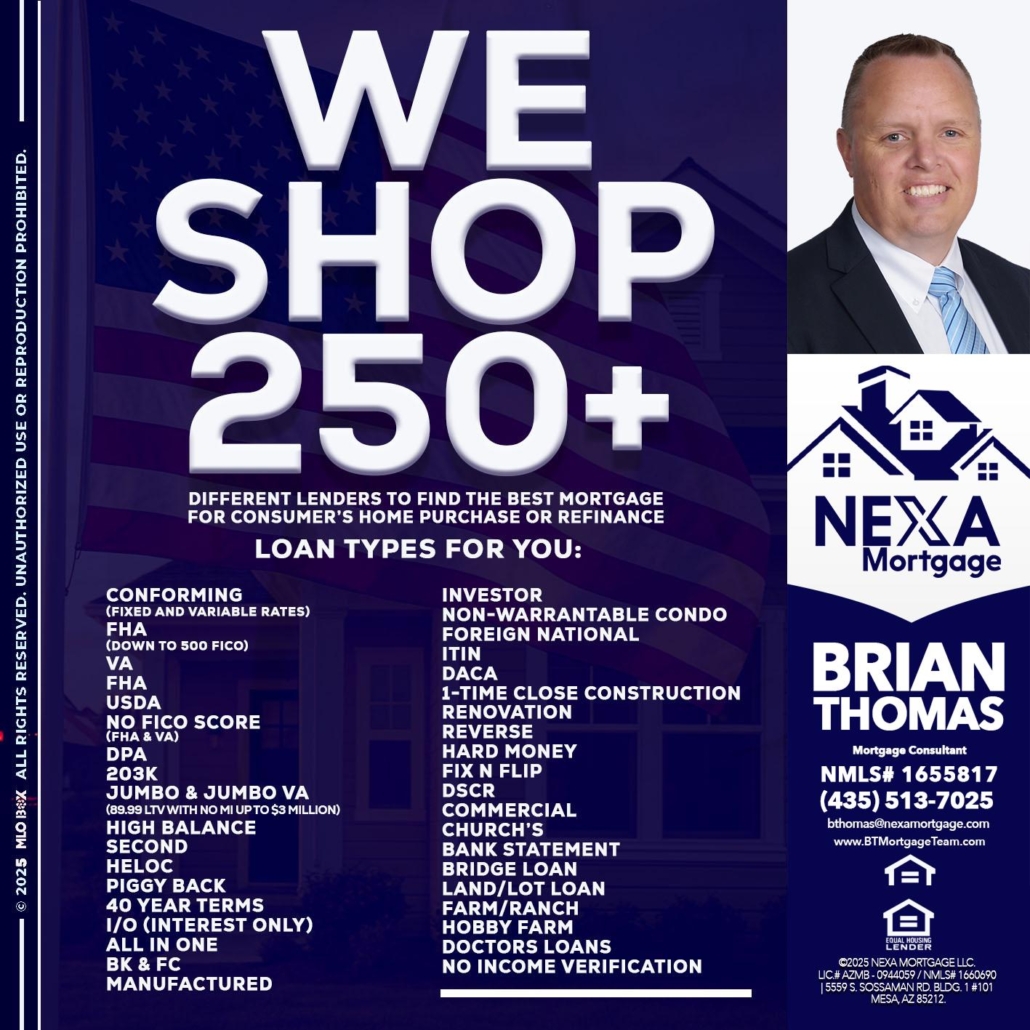 WE SHOP 250+ - Brian Thomas -Mortgage Loan OriginatorHi, my name is Brian Thomas. I’m a Loan Officer with NEXA Mortgage LLC., offering personalized mortgage solutions, fast customized quotes, great rates and service with integrity.